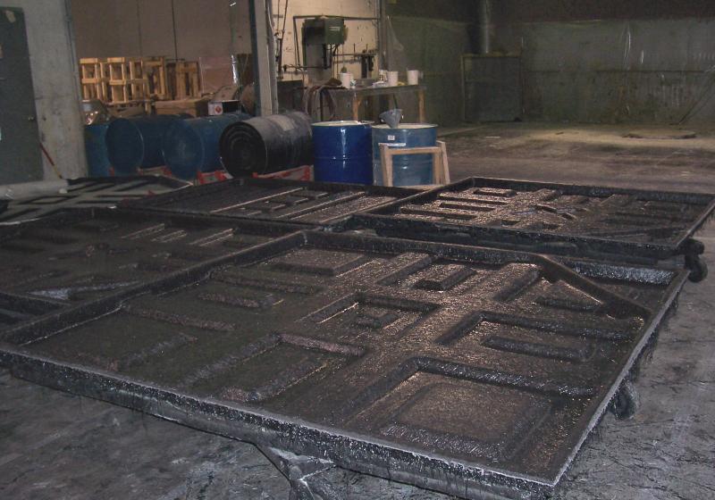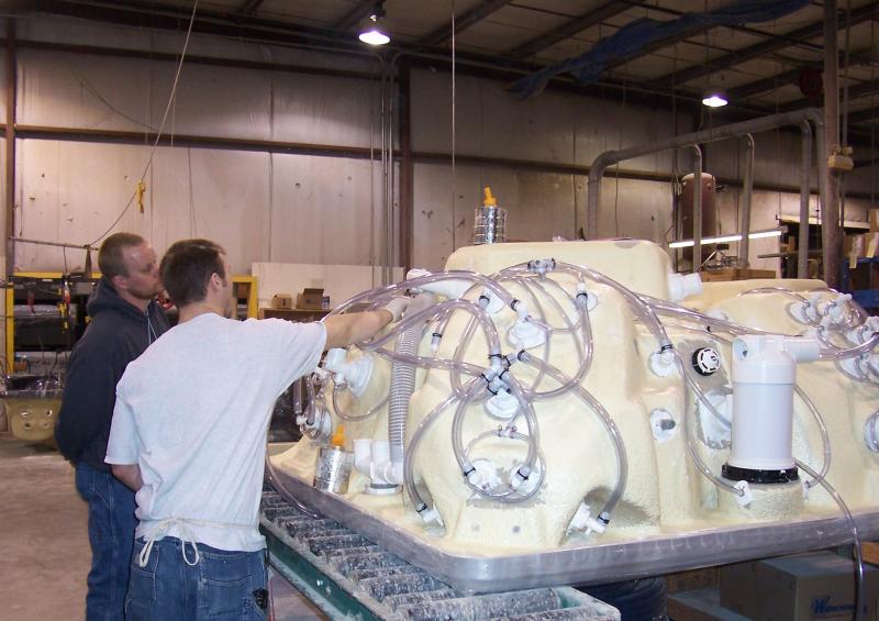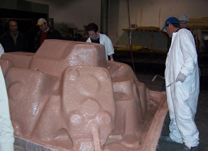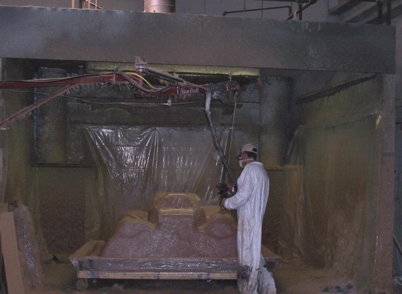 After being sprayed with fiberglass a team of professionals compresses the fiberglass with rollers. Pictured below.