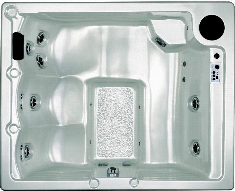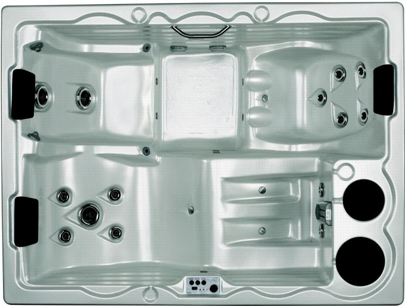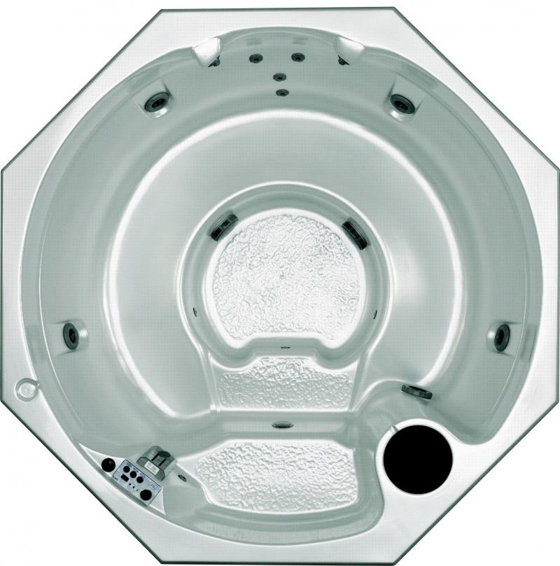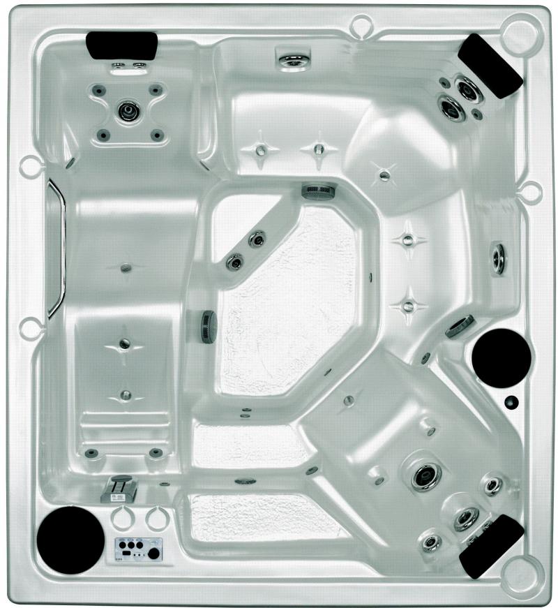 Royal Jewel - Seats 5 in spacious bucket seats and features a cut corner design. Tub has approx. 38 jets including foot & neck jets, waterfall and whirlpool jet. Approx. 79x87x36 (6' 7" x 7' 3"). Holds approx. 340 gallons of water and full weight is approx. 3,400 lbs.