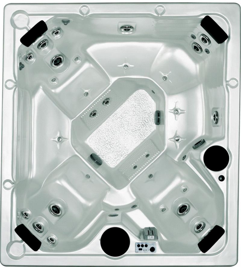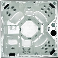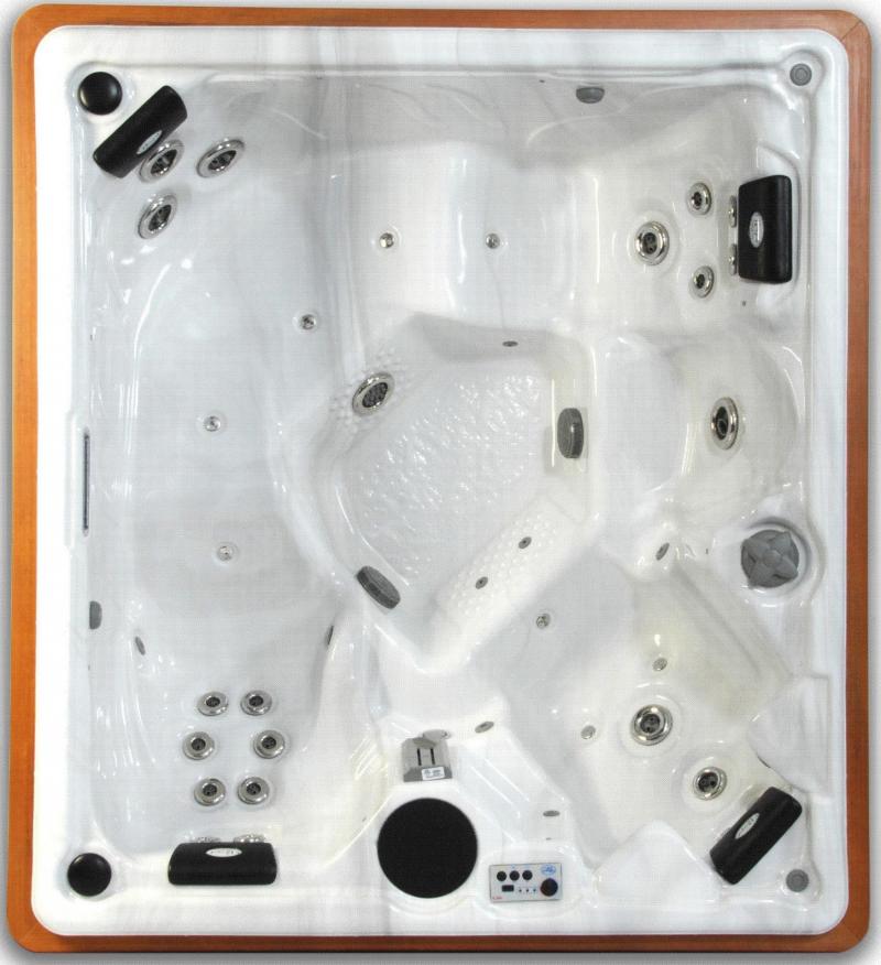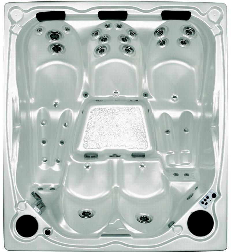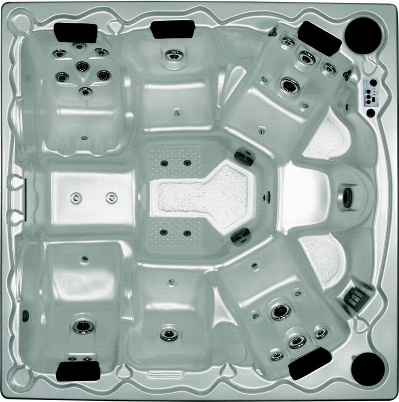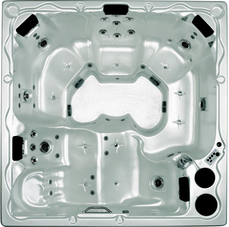 Royal King - Seats 6 people in very spacious bucket seats. Approx. 60 jets including foot and neck jets, waterfall and whirlpool jet. Approx. 94x94x38 (7' 10" squared), holds approx. 575 gallons of water and full weight is approx. 4,600 lbs