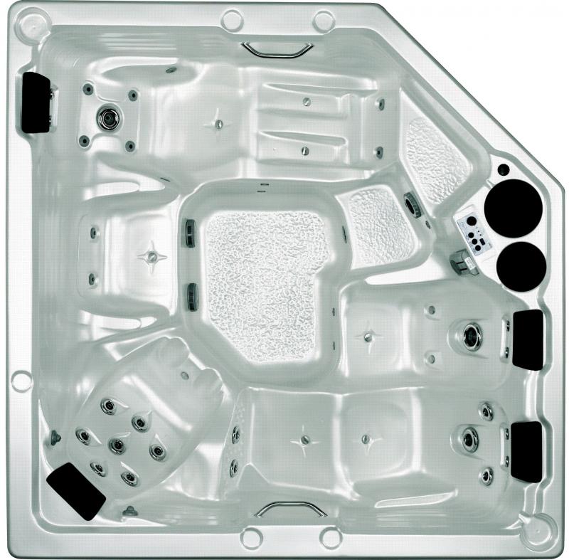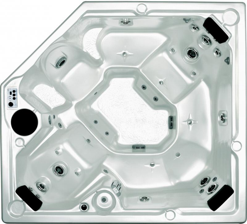Royal Majesty - Seats 6 people in 3 spacious bucket seats, 2 loungers and a whirlpool seat. Tub features a cut corner design. Approx. 45 jets including whirlpool jet, wrap around neck jets, hand & foot jets and waterfall. Approx. 94x94x38 (7' 10"). Holds 465 gallons of water and full weight is approx. 4,520 lbs.
